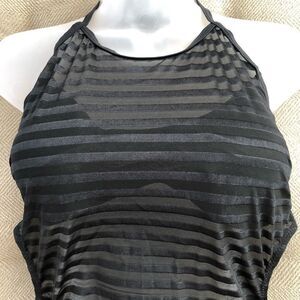 New with tags, SelfieGo black tonal stripe mesh overlay one piece swimsuit that looks like a bikini in the back with a neck and back tie. The overlay is sheer and layered over an opaque white bikini for a bombshell look. Removable bust padding
