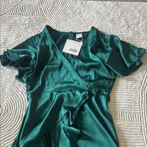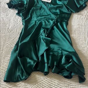 Embrace elegance with the Selfie Leslie Green Flutter Sleeve Wrap Blouse. This chic top features a flattering wrap design and ruffled flutter sleeves, adding a touch of sophistication to your wardrobe. The rich green hue and soft drape make it a versatile choice for any occasion.