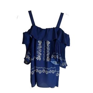 Self-Portrait's 'Flower Spell' top is printed with a white floral pattern, inspired by antique textiles. This picot-trimmed piece is cut from airy blue fabric. Size 10.