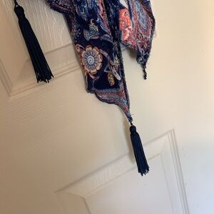 Stylish kimono with a vibrant paisley pattern. Features tassel details. Perfect for layering. Can be paired with, tank, tee, or blouse. Can be paired with a band tee for a unique look.