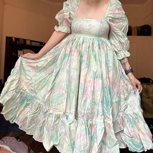 Size small, worn only for photos and tags are still attached. I absolutely love this dress and would get married in it if I didn’t just get married. The print is from their honeymoon collection and features pastel colored tropical leaves and plants.