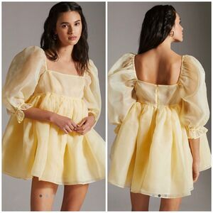 Selkie Puff-Sleeve Square Neck Mini in Banana Yellow. Specializing in fanciful silhouettes with romantic, nostalgia-tinged touches, Selkie delivers contemporary pieces with timeless appeal. Founded by designer Kimberley Gordon, the collection encourages wonder and self-expression, releasing small-batch collections in an effort to reduce environmental waste. In excellent condition. No holes, rips, or stains. Ours is a smoke free home.