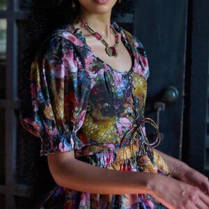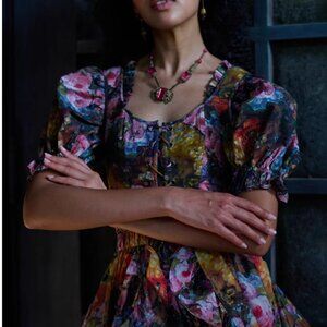 Selkie The Genevieve Duchess Corset Medium Lace Up Black Pink Blush Floral Top