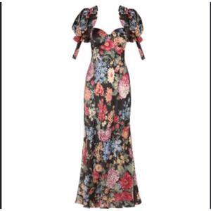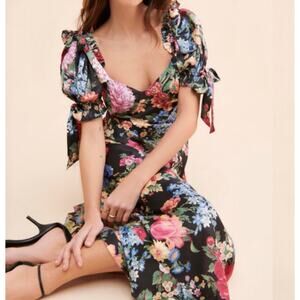 Selkie The Puck Poet 100% Silk Multicolor Floral Sweetheart Puff Sleeve Dress