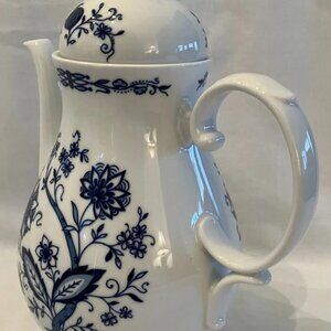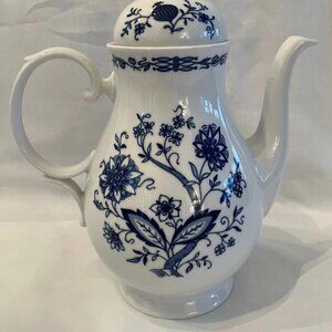 This is a gorgeous Seltmann Weiden Christina Porcelain coffee or tea pot in "Dresden Classic" blue rose pattern. The elegant curves on the handle are beautifully constructed, as is the rose atop the lid. I have been unable to find a similar coffee/tea pot online. This "Dresden Classic" Christina blue rose pattern includes other dishware that can be found online, such as plates, cups, creamers, a gravy dish, a flower vase, etc. This coffee/tea pot probably dates from the 1980s since it shows "W. Germany" on the backstamp, and the Berlin Wall fell at the end of 1989.