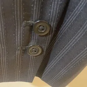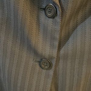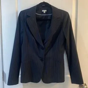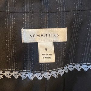 Black with blue pinstripes. Semantics blazer - size 8. Adorable with jeans, a pencil skirt or slacks.