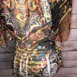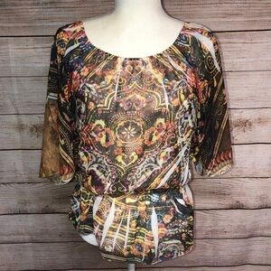 One world semi sheer top with beautiful design. Has an elastic waist for a peplum type look. In excellent condition, no signs of wear.