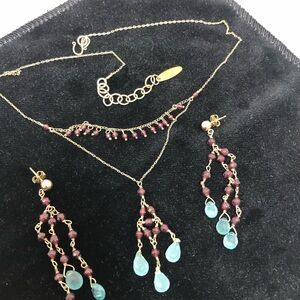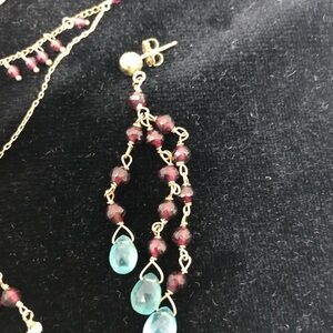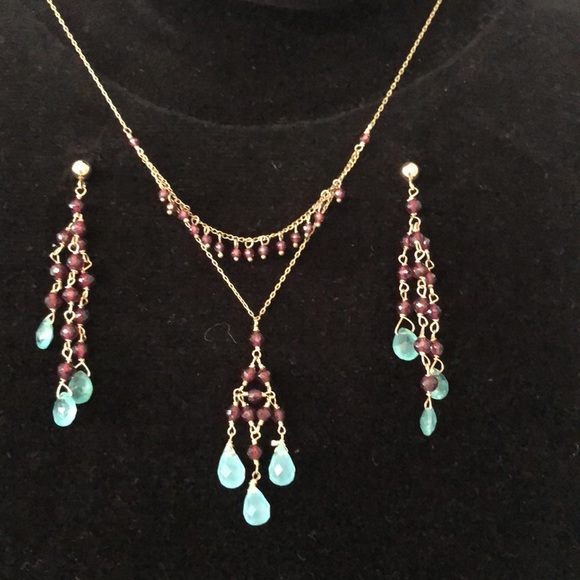 This exquisite jewelry set features a delicate gold chain adorned with vibrant garnet beads and elegant aquamarine teardrop accents. Perfect for adding a touch of sophistication to any outfit.