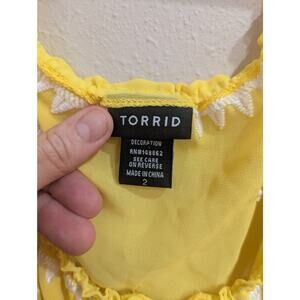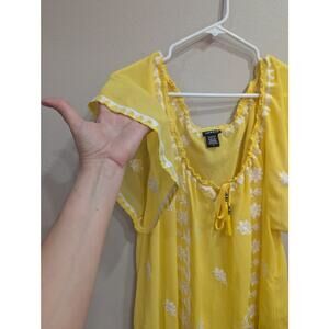 Semi sheer short sleeve peasant style top in yellow w/white floral embroidery 2X by Cato cottage core Renaissance Fair Renfaire beachy boho hippie gypsy music festival spring summer fall bright and cheerful lightweight gauzy billowy beachy yachting old money cruise excursion brunch lunch shopping vacation garden party zoo picnic walk tie front w/tassels