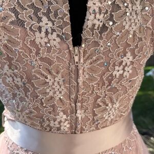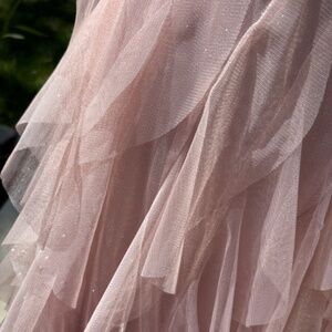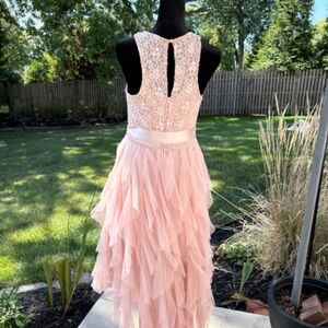 Beautiful high/low blush colored formal dress...ruffled skirt with embedded sparkle...lace overlay bodice with padding and bones, with sparkles of her own...complete with a thick satin ribbon belt...very feminine, excellent condition...worn one time...