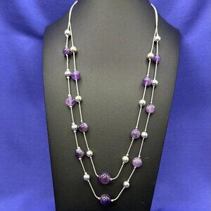 Semi-precious smooth round purple amethyst gemstone dual-strand necklace on silver-tone chain measuring 18-21” (measured at longer strand) adjustable with 3” extender and lobster claw closure. Tests as amethyst on Presidium Gem Tester II. In excellent pre-owned condition.