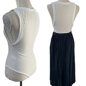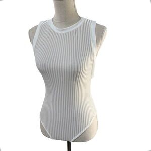 Ivory/bone colored semi-sheer ribbed bodysuit by Blanc. Form flattering fit with a high neckline and larger arm holes like a muscle tee. Thong bottoms with double hook gusset closure. Tried on but never actually worn.