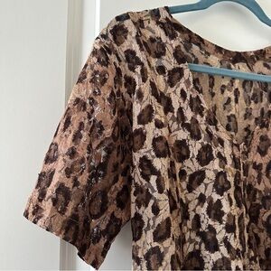 Brown and tan leopard print short sleeve dress. Semi-sheer with a flowy, flared silhouette and v-neckline. Great for layering - looks so cute under black bra & hot pants or another dress.