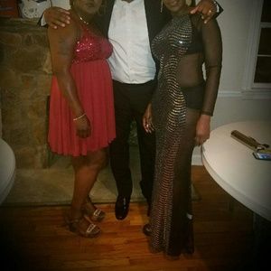 Black sequined gown the sides are shear the front and back are covered in sequins. This gown is definitely a show-stopper I wore it to my 25th class reunion and won best dress!