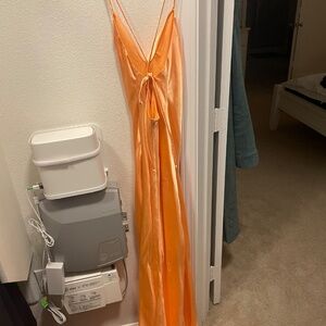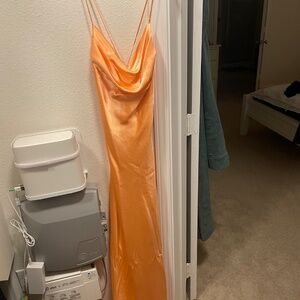 Orange satin semi-formal gown worn in two weddings this past summer. Cute cowl neck and criss cross straps in back.