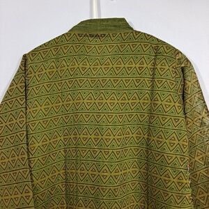 Shades of green and brown, size XL, but measures like a medium. Pit to pit 20", length 36". Top front is lined. Beautiful Asian design! Pullover. Long side slits.