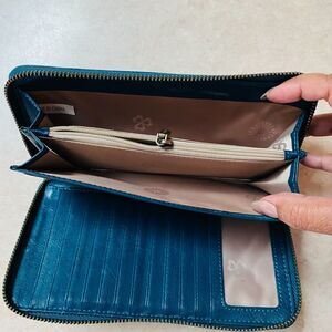 Green leather purse in good used condition with 18 spaces for cards, zip around that facilitates better opening. It has an internal pocket with a zipper for coins and two additional compartments where you could carry your cell phone.