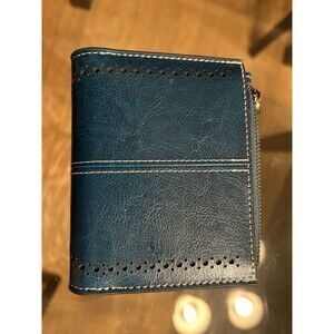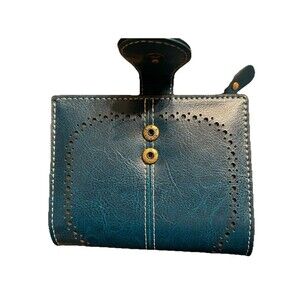 Sendefn TURQUOISE SUNFLOWER Snap Wallet. Leather. Sunflower embellished snap. Zippered pocket. 9 total compartments. Tiny dent in the leather above the flower. Could be the natural indentation in the leather. See picture.