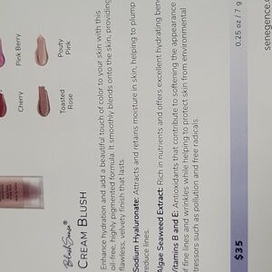 Senegence cream blush enhances hydration and adds a beautiful touch of color to your skin. It blends smoothly into your skin, providing a flawless, velvety finish that last all day. It contains sodium hyaluonate, algae seaweed extract, and vitamins b and e. pink berry in color
