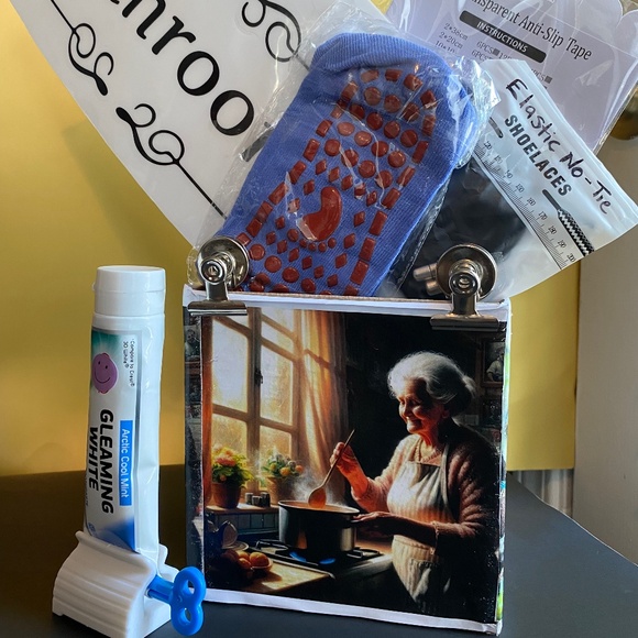 6 Non slip floor strips—-non slip cotton socks,—2 strong door magnets—-No-tie shoe strings—Large restroom door sticker—-tube holder OR Identity ink roller