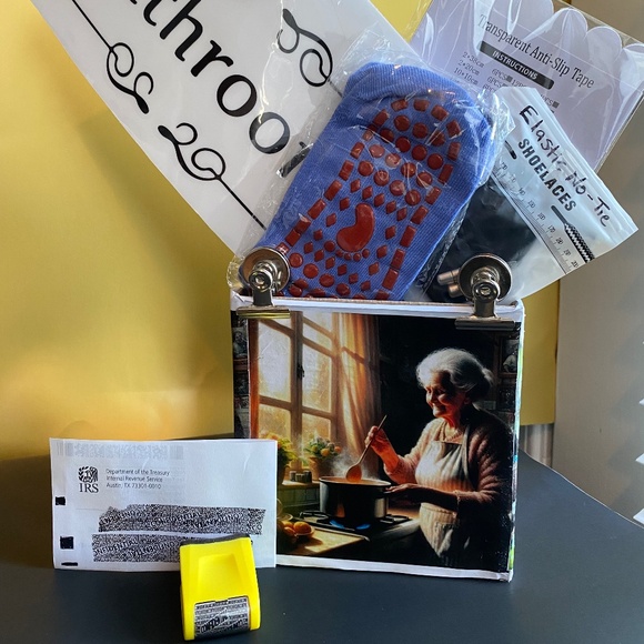 6 Non slip floor strips—-non slip cotton socks,—2 strong door magnets—-No-tie shoe strings—Large restroom door sticker—-tube holder OR Identity ink roller