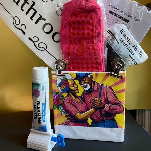 6 Non slip floor strips—-non slip cotton socks,—2 strong door magnets—-No-tie shoe strings—Large restroom door sticker—-tube holder OR Identity ink roller
