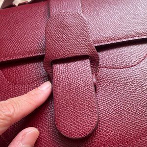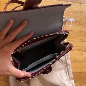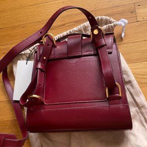 Excellent used condition! Worn a few times, realized it wasn't for me. Beautiful deep red color. Great bag, convertible ways to wear: crossbody, top handle, or even a backpack. I also love that it fits a Kindle.