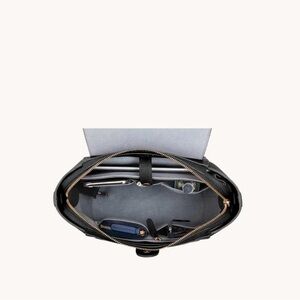 The Senreve Black Midi Bag is a sophisticated accessory, featuring a sleek trapezoid shape and a distinctive flap closure. Its structured design and sturdy top handle make it an ideal choice for those seeking both style and functionality. My measurements are approx. about 11" across the bottom and about 10" tall so that correlates with the midi