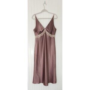 Sensara Satin Long Nightgown Brown Lace Trim V Neck Plunge Womens Size L
