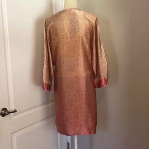 Lovely. Pattern is gold and brown animal print with floral embroidery on front and coordinating pink accents. Bathrobe has an inner side tie to keep front panel in place. 100% Polyester - see photos for care. Measurements upon request.