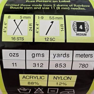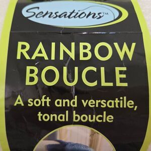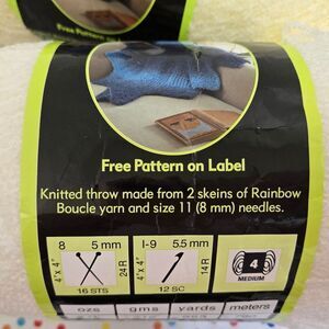 Soft and versatile Sensations Rainbow Boucle yarn in cream ( looks yellow to me!) and white. Perfect for knitting and crochet projects. JUMBO SKEIN OF 11 OUNCES AND 853 YARDS EACH ENOUGH TO MAKE A THROW PATTERN ON LABEL
