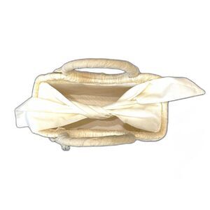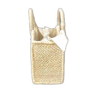 Toquilla straw exterior with cotton canvas interior Open top with ribbon tie closure Grosgrain wrapped top handles Measures approx 9.5" W x 8" H x 4.5" D Top handles measure approx 3.5" in diameter Hand made in Ecuador