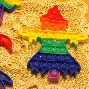 Three poppers, in shape of ghost, pumpkin and scarecrow. These are new but they have light paint irregularities, see examples in last two close ups. Lots of poppin fun with these fidget toys/focus toys for sensory input.