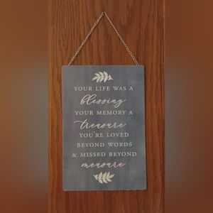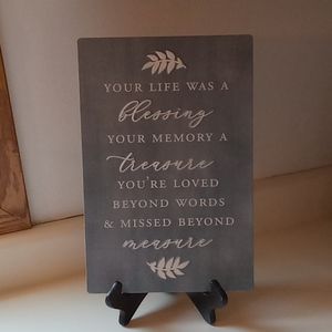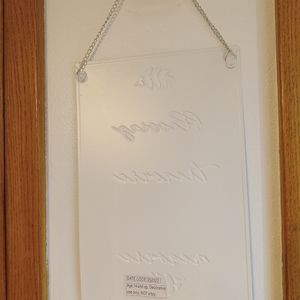 The tin sign measures approximately 8"Lx17 1/4"H (with the chain) & 12"H (without the chain). It can be hung on the wall or put on a plate stand. I have both ways pictured. The sign is new and never been used. Plate stand not included.