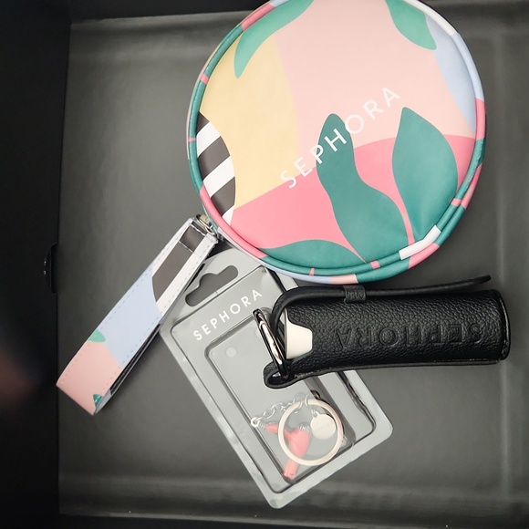 Stylish Sephora set with vibrant colors. Includes key chain, lipstick holder and a wristlet.