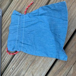 Jeans looking bag with a red and white shoelace-type drawstring and the words Play in White.