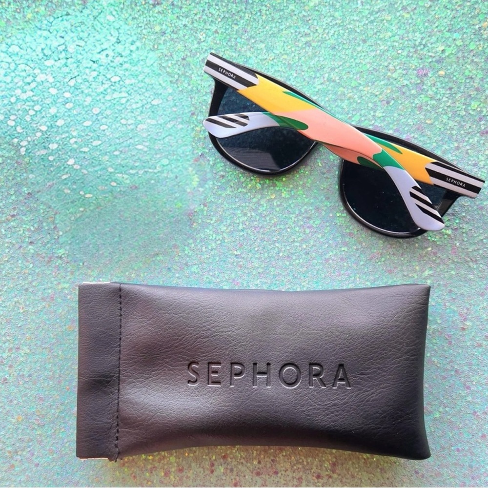 Sephora wayfarer sunglasses with retro print on arms of glasses.