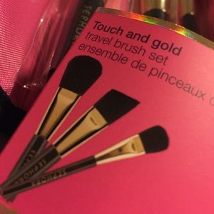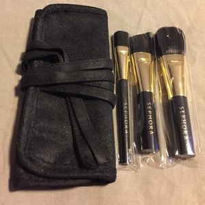 Brand new, still in packaging (only taken out for photos). Short handles are perfect for travel and comes with a sleek pouch with a plastic covering for the brushes once they are used. Set contains three brushes; powder, foundation and shadow.