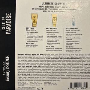Sephora Beauty Insider Isle Of Paradise Ultimate Glow Kit NEW in box. Brand new with box, never used or opened. Contains: 4mL Medium Self-Tanning Drops, 30mL Brilliantly Bright Body Polish, 20mL Brilliantly Bright Body Moisturizer, Tanning Applicator Mitt, Get Body Posi Booklet