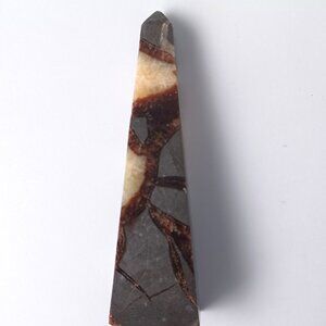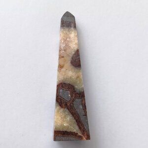 This item is a carved and polished septarian stone in the shape of an obelisk, wand or tower. This obelisk is approximately 3.1 inches tall. It weighs 2 oz (56 grams). Septarian Stone is a 3 color concretion composed of aragonite, calcite and limestone.