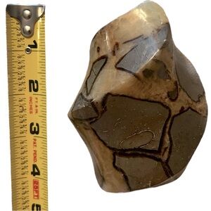 Septarian, often called "Dragon Stone," is considered a powerful spiritual stone with grounding and protective properties. It's believed to help with emotional healing, communication, and spiritual growth, particularly by connecting one to their inner strength and the earth's energy. It's also thought to aid in accessing past-life information and understanding one's soul purpose Beautiful polished stone sculpture with intricate patterns. Features shades of gray, black, tan and cream.