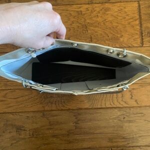 Super functional with a wooden base with feet to keep the bottom clean and stand upright, three closure snaps and 2 inside pockets to hold what you need (passport, sunglasses, lipstick, sunscreen, keys, etc). Very practical handles consist of cable wire encased in clear plastic ( modern and easy to clean) and comfortable over the shoulder.