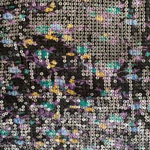 Green top and multicolor green, purple and blue sequenced bottom. Looks like two pieces with a belt but it’s all one piece. Size: S