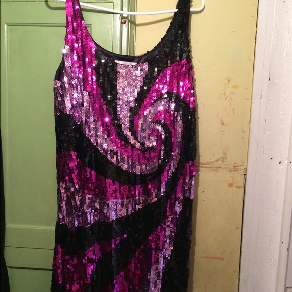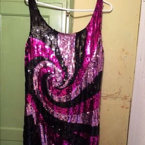 This is a pink, light pink, purple, n black sequined dress. It has thicker straps and lays just over your knees. This is a good dress for a wedding, fancy party, New Year's Eve, or even a night out on the town. Dress only worn once