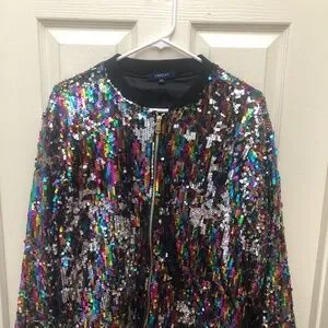 Reversible sequence jacket. The sequence can either be all rainbow, or silver when flipped. Silky inside the jacket, comfortable to wear. Zips up in the front.