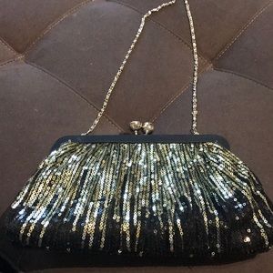 Effective for a night out. Satin inside and sequence detailing outside in a goldish silver tone. Beautiful. Never used