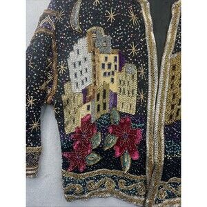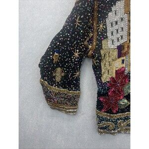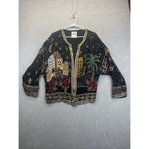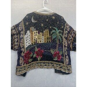 Sequin Arabian Desert Night Scene Black Beaded Jacket Silk Size L Vintage 80s