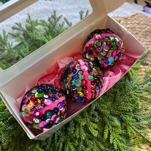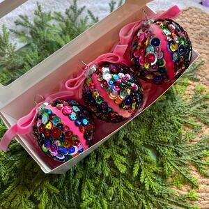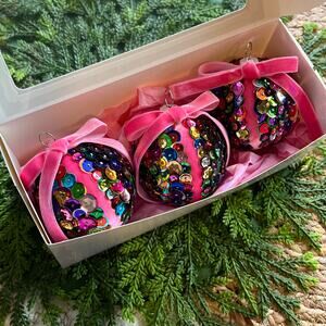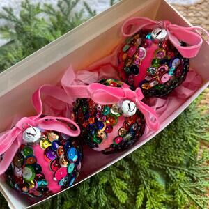 Sequin Ball Push Pin Christmas Ornaments Multicolored Pink Velvet Bow Set of 3