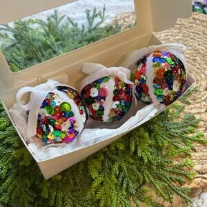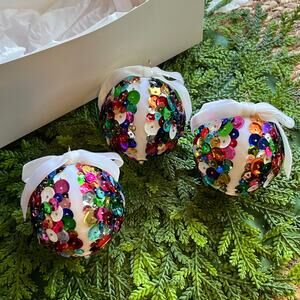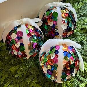 These are approx 2.5” balls but this does not include the ribbon. They have a white velvet ribbon and bow. Multicolored sequins were layered on.