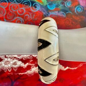 Bold and graphic vintage clamper bracelet by Sequin, featuring glossy ivory and black enamel with gold-tone accents and tiny rhinestone teardrop details. The geometric zigzag design gives it a chic Art Deco vibe that instantly elevates any outfit. Spring hinge opens and closes smoothly.